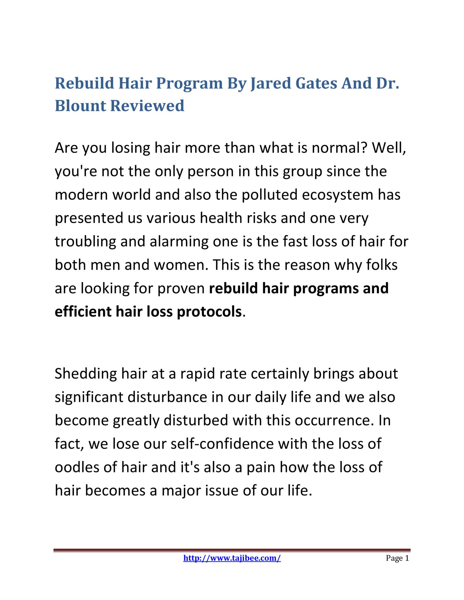 File type pdf rebuild hair program by jared gates jared gates was the founder of the hair rebuild program. Anyway this program is a $40 ebook by jared gates. Blount is amazing new step by step natural system that is scientifically proven to help reverse hair loss in 4 weeks.
