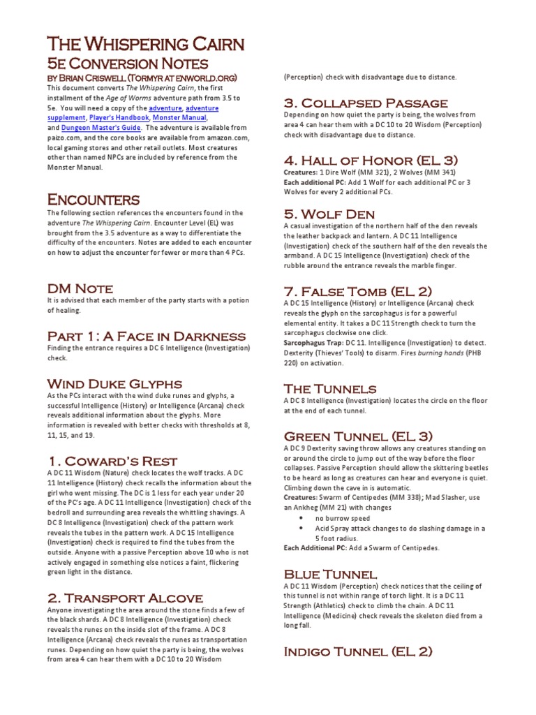 The whispering cairn i the morning following their return to the blood claw village, the team meets again and sets about trading what they can of their loot. 5e conversion notes by brian criswell (tormyr at enworld.org) (perception) check with disadvantage due to distance. You will need a copy of the adventure, adventure 3.